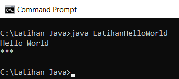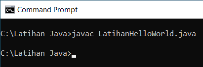Seperti terlihat, file hasil kompilasi LatihanHelloWorld.class yang dijalankan melalui command java. A